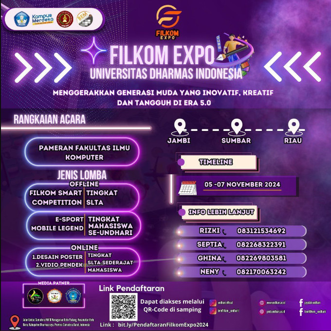Fakultas Ilmu Komputer (FILKOM) Universitas Dharmas Indonesia sukses menyelenggarakan FILKOM EXPO 2024 pada tanggal 5 hingga 7 November 2024. Kegiatan tahunan ini menjadi ajang bergengsi yang mempertemukan kreativitas, inovasi, dan semangat kompetisi generasi muda dengan mengusung tema “Menggerakkan Generasi Muda yang Inovatif, Kreatif dan Tangguh di Era 5.0.”